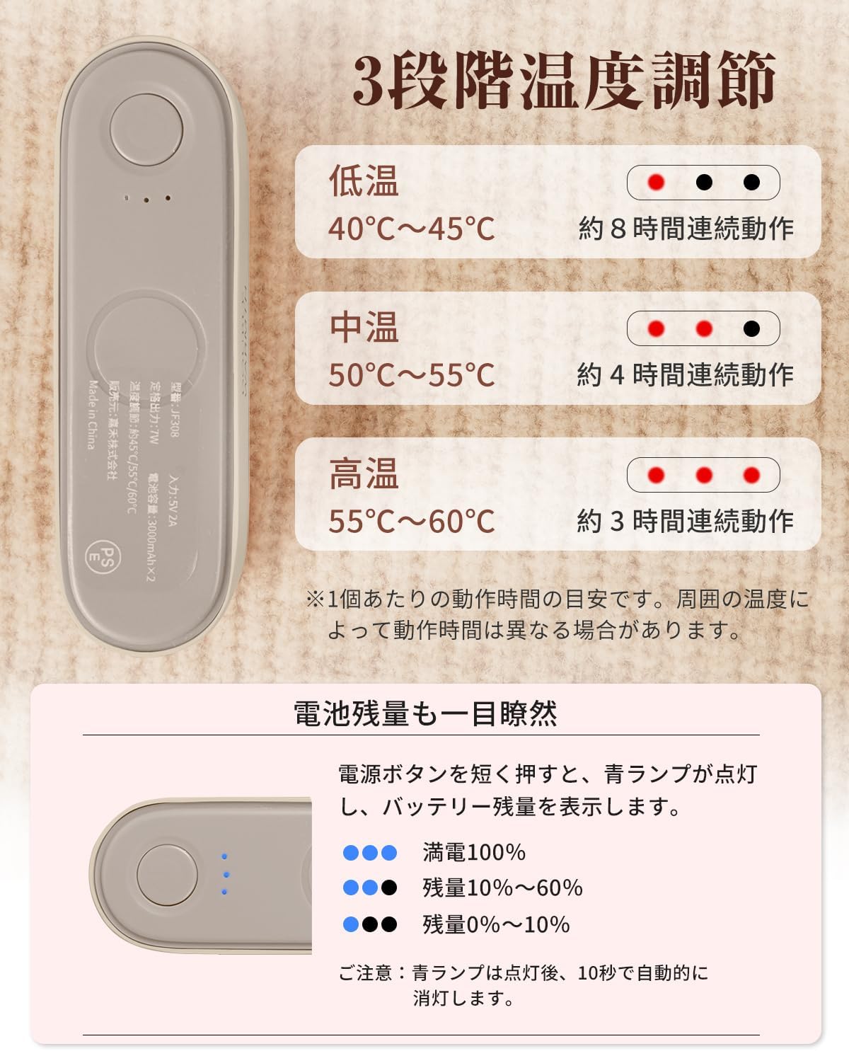 低温であればより長く、高温ではしっかり暖かさを感じられます。